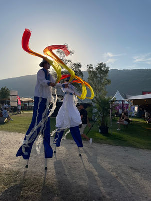 Deux costumes, deux déambulations, deux personnages qui se rencontrent se frôlent, se touchent, tiennent en équilibre, s’envolent presque. Se connaissent-ils ? Se font-ils confiance ? Ils jouent, s’amusent, se baladent dans une autre dimension, plus lente, plus vaste, plus haute. Ils se confient mutuellement leur poids et cherchent ensemble leur équilibre. Ces deux géants s’amusent dans la dimension du « là-haut » où ils sont perchés…
